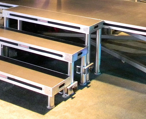 The LC-2 is used to clamp deck legs together when X-frames are not used. Some typical examples are: small stages constructed using legs, Choral Risers, and custom stairs made using decks as treads.
