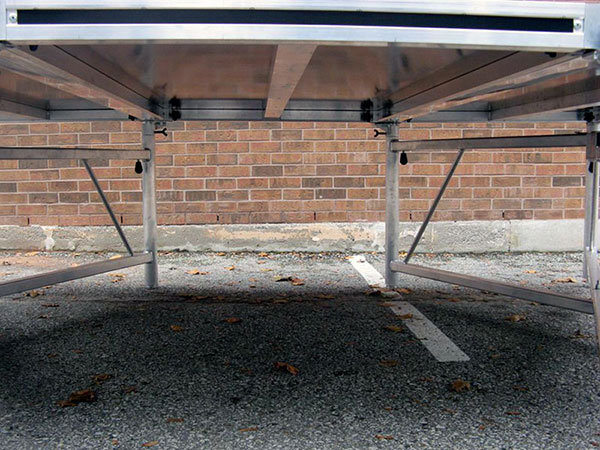 Note full-length welded aluminum box extrusion brace. X-frames are telescopically adjustable and include integrated leveling feet.