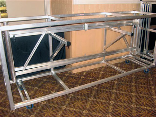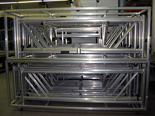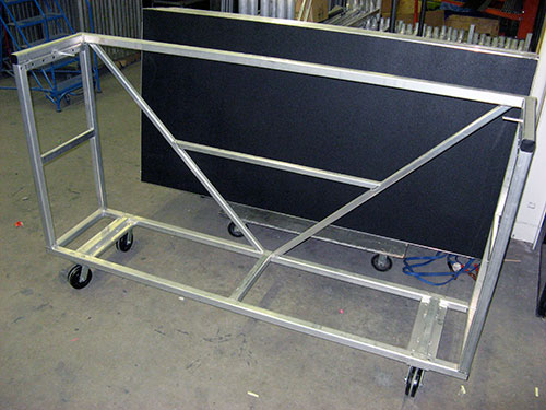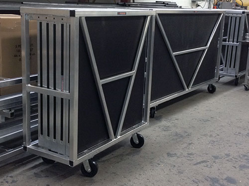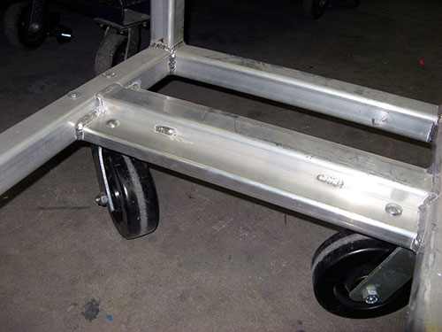 Carts are welded from 2″ square aluminum tubing, cross-braced for structural strength and fitted with high capacity casters.