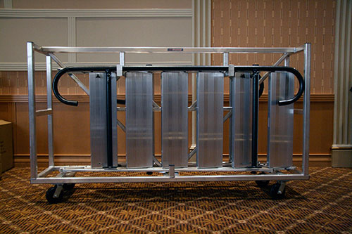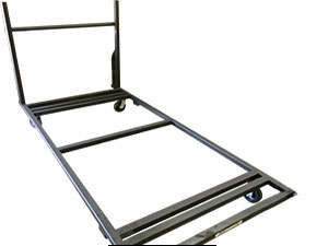 Stackable side-loading X-frame dollies (shown here) facilitate transport of medium sized frames. Top loading dollies are generally used for smaller X-frames.
