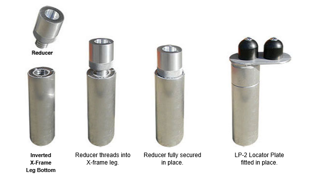 The image shows the bottom of an X-Frame leg with the Leveling Foot removed and REDUCER positioned then screwed into place. The Reducer’s function is to make the diameter of the lower leg the same as that of the upper Telescopic Insert so that regular Locator Plates can be used as usual.